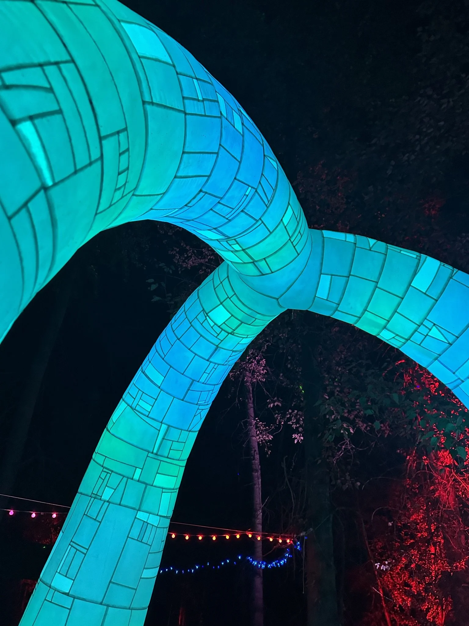A light up inflatable sculpture made from a mosaic of patchworked fabric scraps.