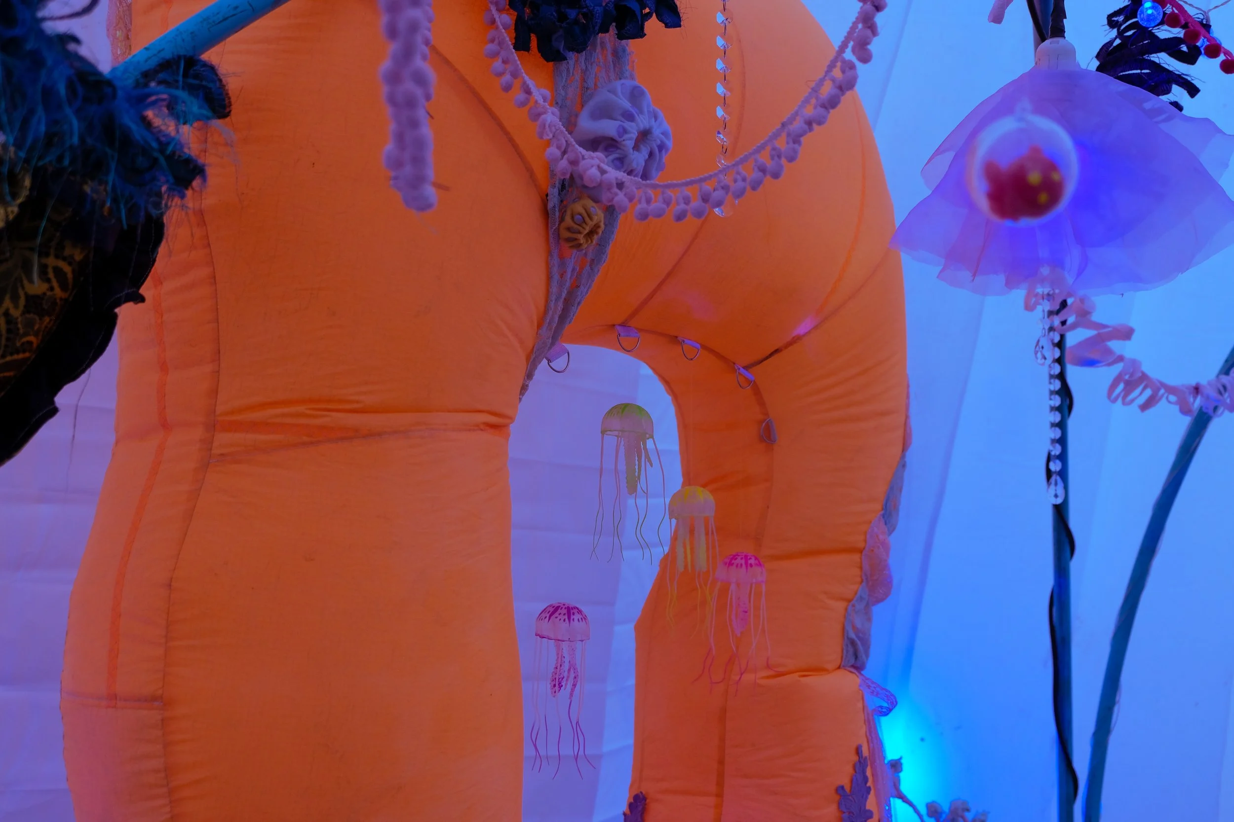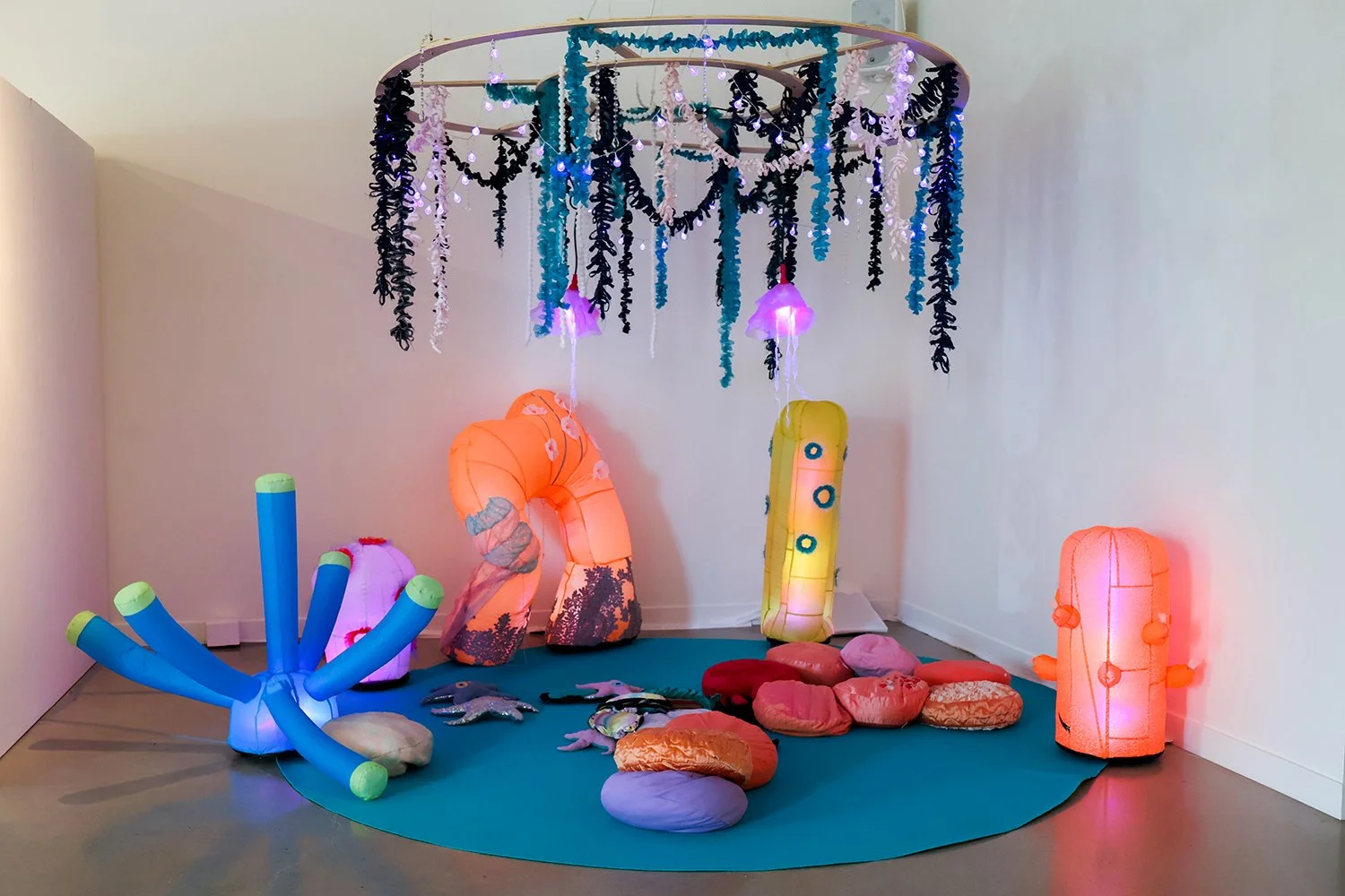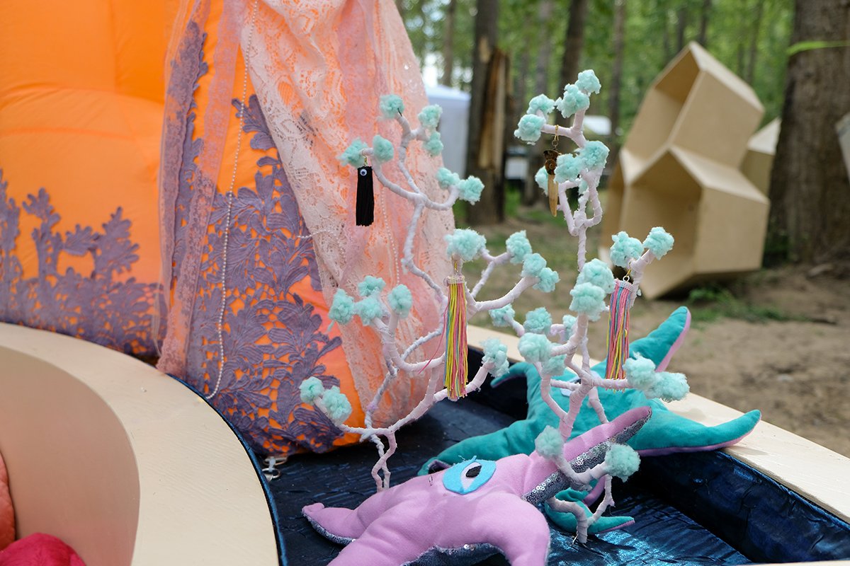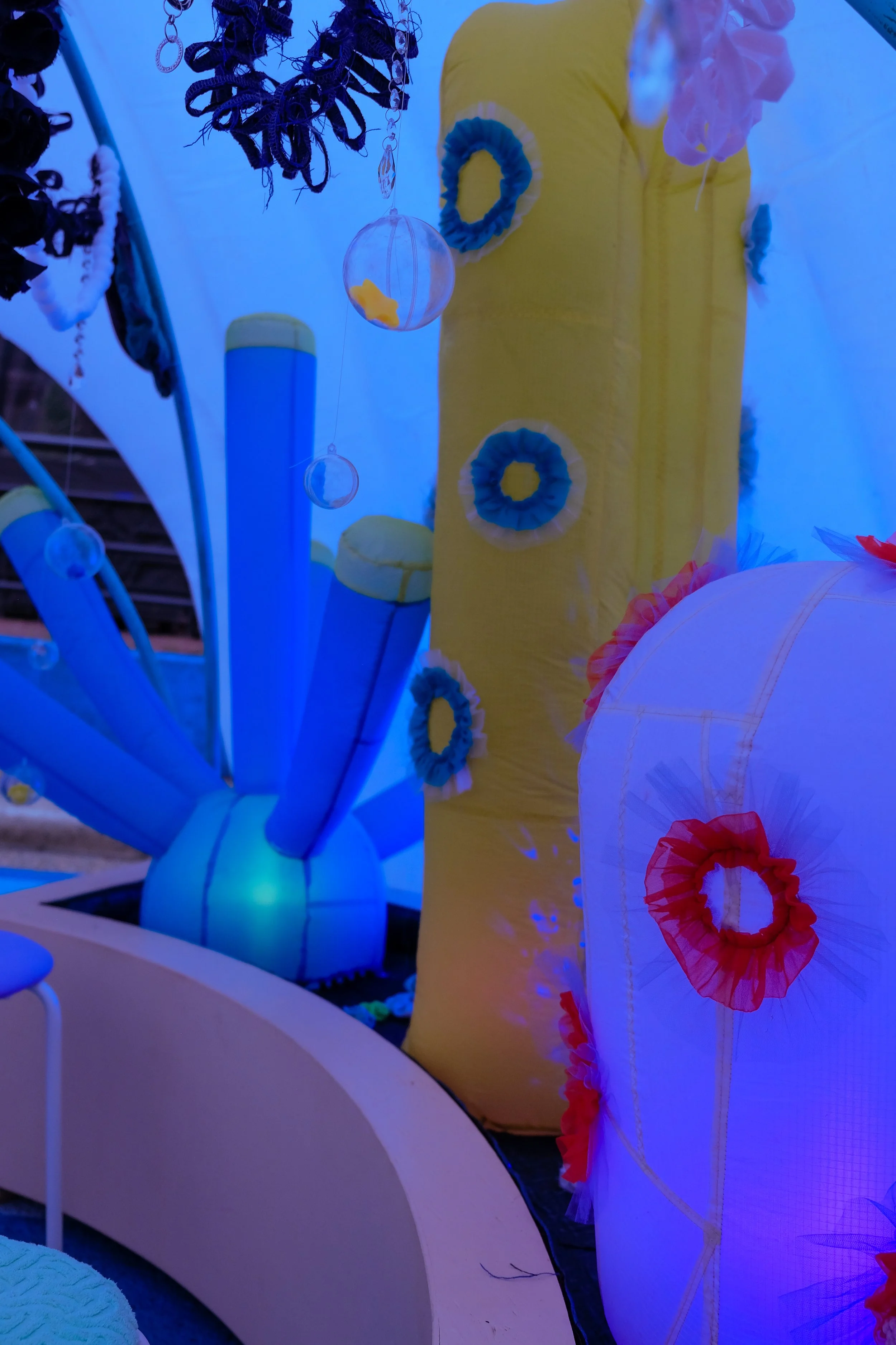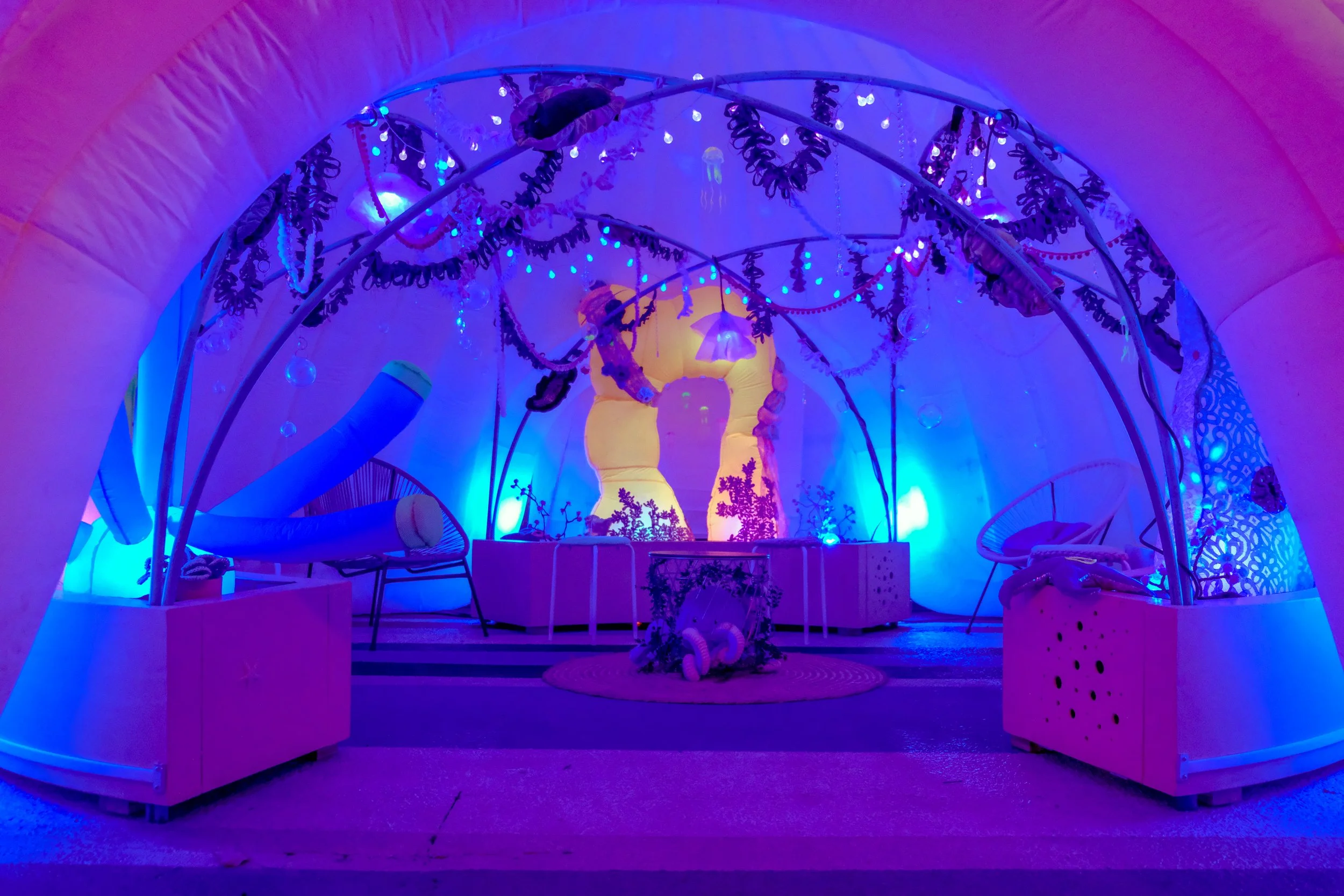 Featuring inflatable coral sculptures, upcycled textiles and plenty of cushions, the Submerged Sanctuary is an interactive space for participants to relax and reflect on the beauty of the ocean. A hugely resourceful installation featuring a range of upcycled materials that have been manipulated into whimsical and otherworldly tactile pieces. The piece immerse viewers into an underwater world.